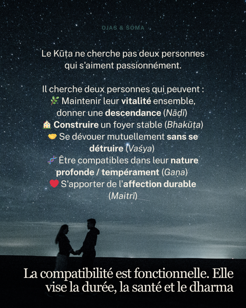 Et surtout : Nāḍī Kūṭa, le critère de santé et de compatibilité énergétique profonde (8 points) est prioritaire sur tout. Un couple avec 28 points mais un Nāḍī Doṣa est considéré inauspicieux. Sans exception.