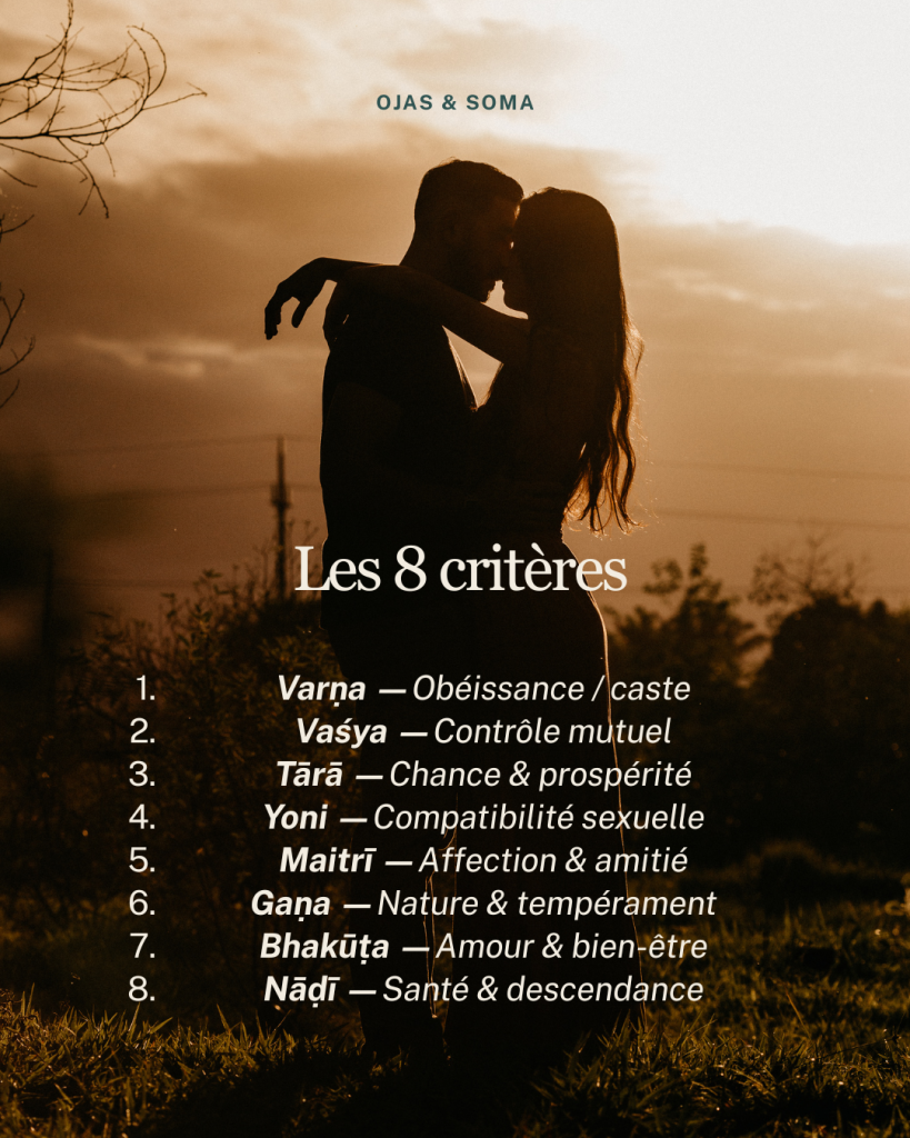 Kūṭa, le système de compatibilité du Jyotiṣa (astrologie sidérale indienne), évalue 8 critères basés sur les nakṣatras lunaires des deux partenaires.