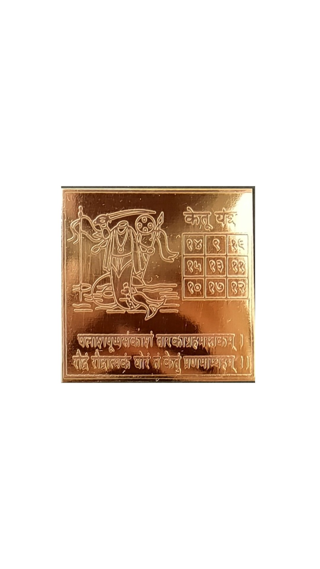 Gravé avec soin sur une plaque en cuivre, le yantra à Ketu aide au dépouillement intérieur, renforçant la connexion au Soi profond & nettoyant des parasitages (émotionnels/spirituels). Le Ketu yantra pacifie les maléfices de Ketu dans le thème natal d’une personne & renforce les qualités bénéfiques inhérentes à la planète.