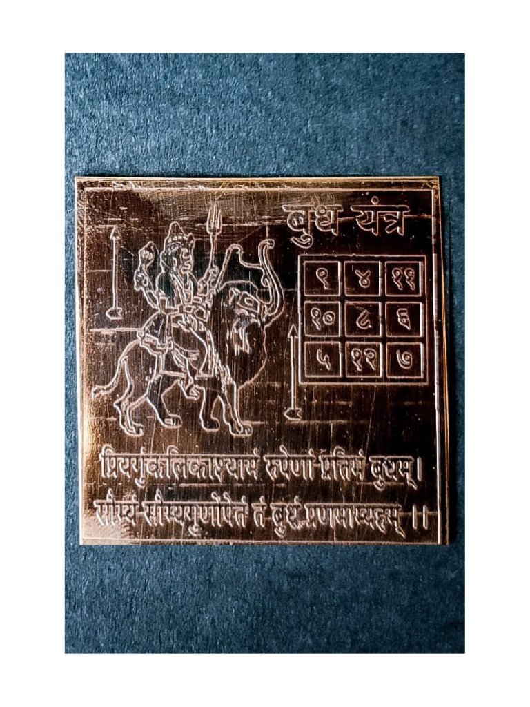 Gravé avec soin sur une plaque en cuivre, le yantra à Mercure (Budha) développe la créativité. Ce yantra améliore le sens de l’humour ainsi que l’esprit et l’intelligence. Il favorise également la relation avec les mathématiques, l’informatique et l’électronique. Le Budha yantra pacifie les maléfices de Budha (Mercure) dans le thème natal d’une personne. Il renforce les qualités bénéfiques inhérentes à la planète.