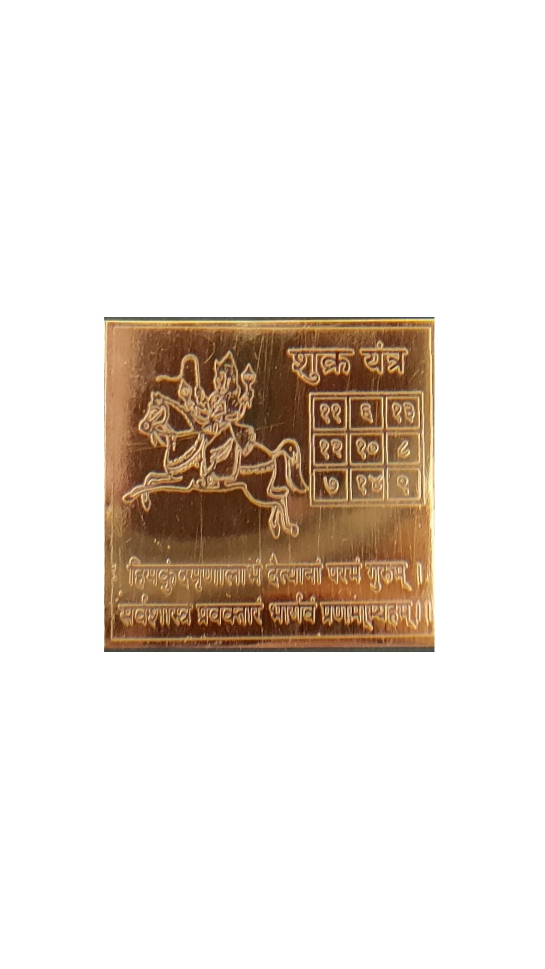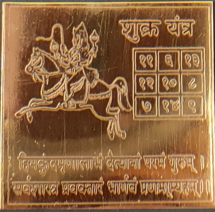 Gravé avec soin sur une plaque en cuivre, ce yantra bénit d’une belle vie amoureuse. Il attire les richesses & améliore l’expression artistique ou créative. Le yantra à Vénus pacifie les maléfices de Vénus dans le thème natal d’une personne. Il renforce les qualités bénéfiques inhérentes à la planète.